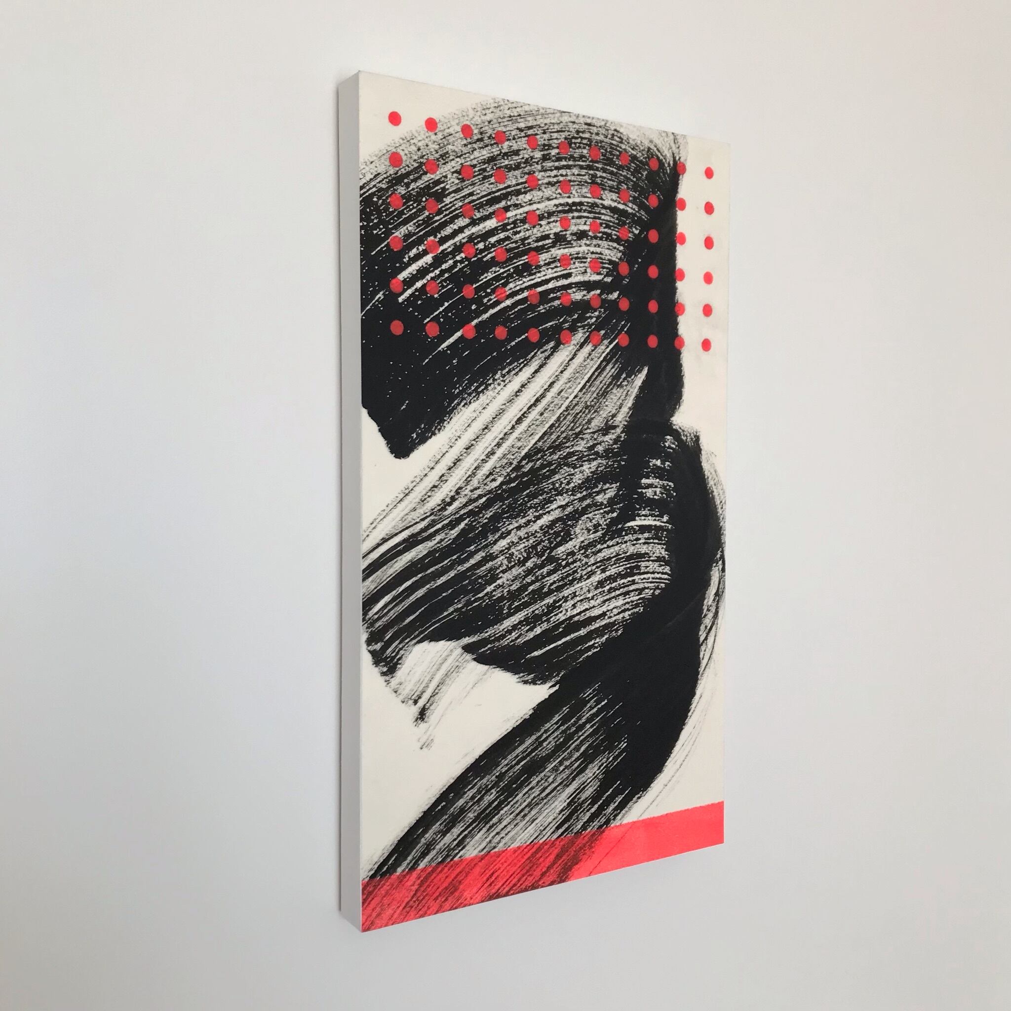 墨で筆の赴くままに描き、その筆致を生かすよう蛍光レッドの絵の具でドットを描き、下のラインは丁寧にローラーで塗り重ねました。